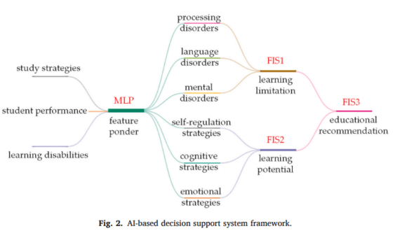Studiet foreslår et FIS(fuzzy interference system) framework opdelt i tre dele. Først (FIS1) tages der højde for, at elever kan have flere handicap (fx ord- og talblindhed, depression, stress og angst osv) og at ikke alle med samme handicap er lige udfordret pga. det specifikke handicap. Eleven skal dernæst vurdere, hvor meget hvert handicap påvirker deres læring på en værdi fra 0 (aldrig) til 3 (altid). Dernæst (FIS2) skal eleverne evaluere, hvilke af 28 læringsstrategier de fortrækker at bruge, igen på en skala fra 0-3. Læringsstrategierne opdeles i selv-regulerende-, kognitive- og emotionelle strategier. Ud fra disse værdier skal AI analyserer, hvor udfordret den aktuelle elev er, hvor højt deres læringspotentiale er, hvilken undervisningstilgang er bedst for eleven (fx 'peer mentoring'), og hvilket læringsteknikker (fx gruppearbejde og læringsplatforme med hjælpe redskaber) (FIS3).